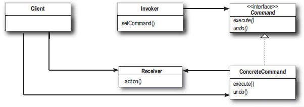 - 모든 커맨드 객체에서 구현해야 하는 인터페이스이며 리시버에 특정 작업을 처리하라는 인 보커의 지시를 전달한다.