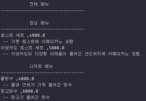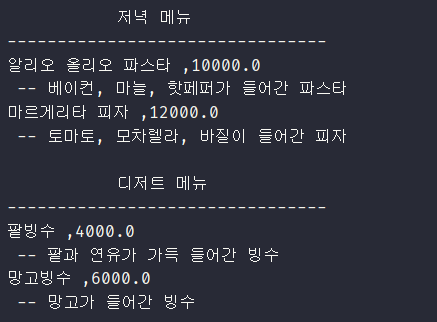 - 출력을 확인해보면 점심, 저녁 메뉴에 디저트 메뉴가 알맞게 들어간 것을 알 수 있다.