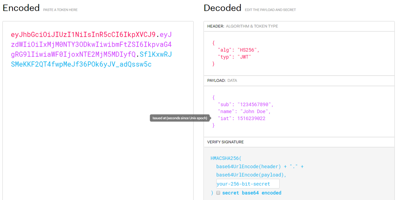 - https://jwt.io/ 에 들어가면 볼 수 있는 JWT의 Encoded, Decoded이다.