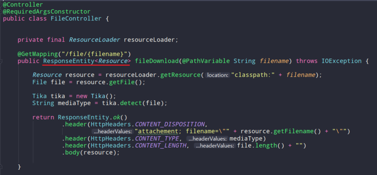 리턴 값이 ResponseEintity <T> Generics타입 T에 전송하고 싶은 본문의 값을 넣으면 된다. 현재는 파일 다운로드를 구현하므로 파일 resource를 넣은 것이다.