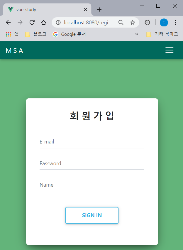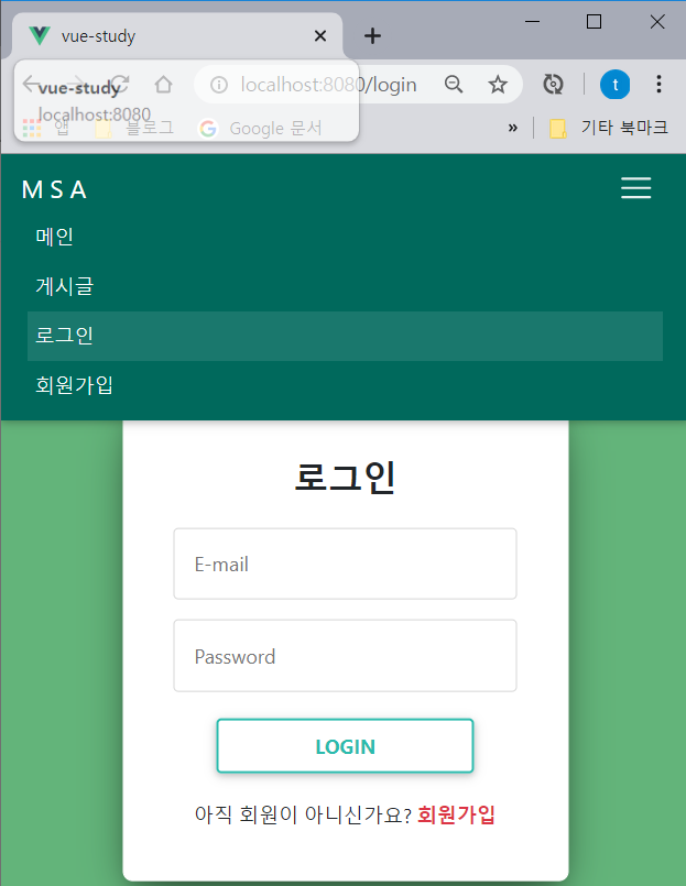 - 로그인, 회원가입 화면을 디자인하고 확인해보면 위와 같이 메뉴를 클릭했을 때 정상적으로 라우팅이 되며 로그인 라우터일 때 로그인이 강조되는 것을 알 수 있다.