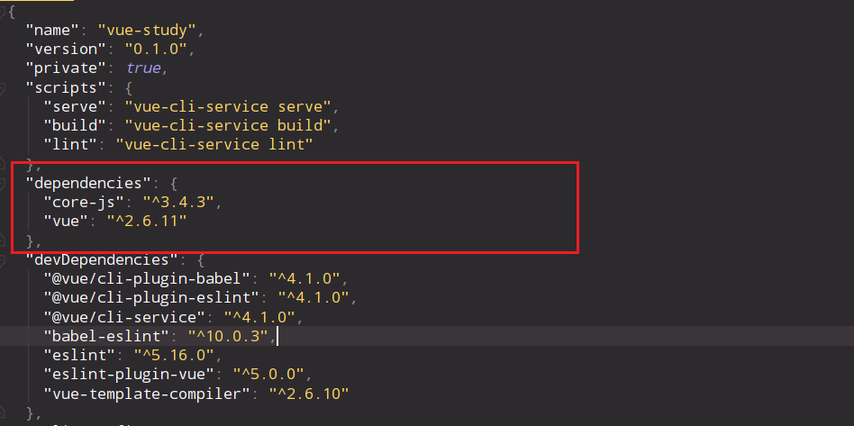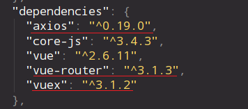 - vue create로 생성한 프로젝트의 package.json을 보면 core-js, vue만 의존성이 추가된 것을 알 수 있다.