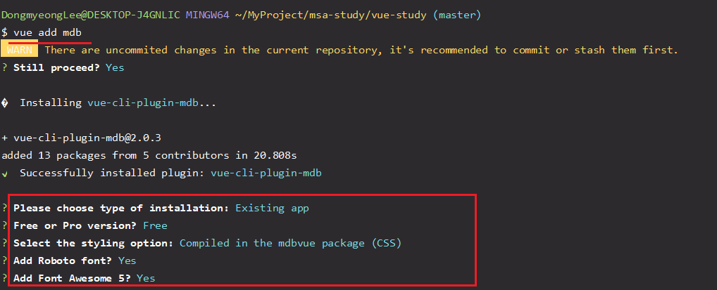 - 터미널에 vue add mdb를 입력하면 아래 빨간 박스와 같이 원하는 옵션을 선택하면 된다.