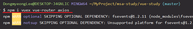 - 화면 제작에 앞서 뷰의 코어 라이브러리인 vue router, vuex와 axios를 설치한다.