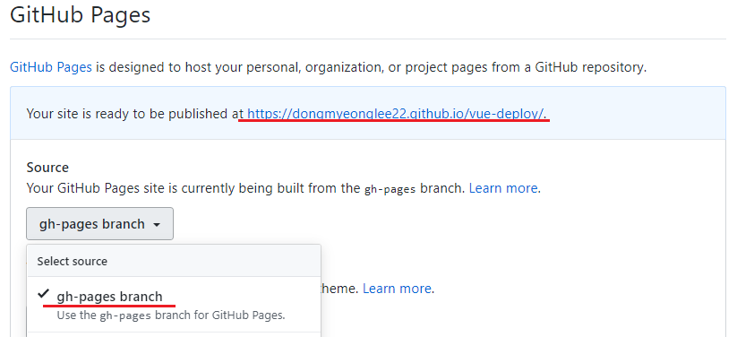 - 생성한 GitHub Repository에서 GitHub Setting에 들어가 아래와 같이 GitHub Pages를 gh-apges로 설정해준 후 배포된 주소로 들어가 보면 정상적으로 배포된 것을 확인할 수 있습니다.